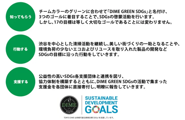 3人制プロバスケットボールチームTOKYO DIMEでは、チーム理念である「3×3競技とバスケットボール界全体の普及と発展」を目指す過程において、さらに広範な社会全体に対して寄与していく為、2015年に国連サミットで採択されました「SDGs(持続可能な開発目標)」に沿った独自のゴール設定として、「DIME GREEN SDGs」を2020シーズンより新たに追加したことを発表。チームを応援するファン、サポーターそして地域の皆様とともに社会に必要とされるゴールの達成を目指す。