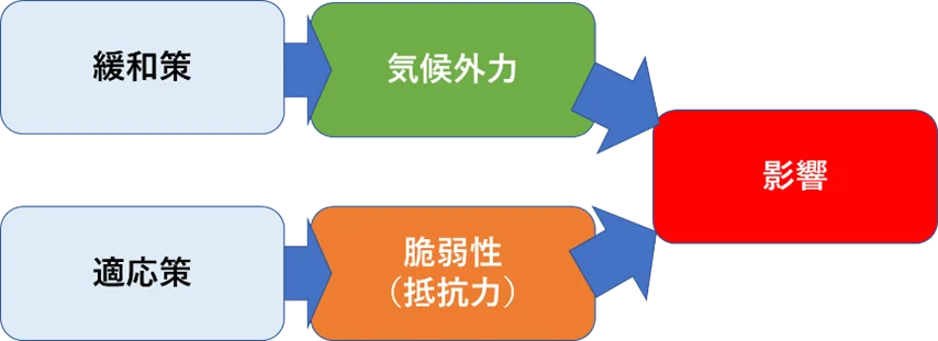 ここで、気候変動による影響について整理してみましょう。気候変動の影響は、気候外力(気温上昇、豪雨の増加といった現象)・抵抗力(気候外力に対する対応力)の関係性によって決定されます。