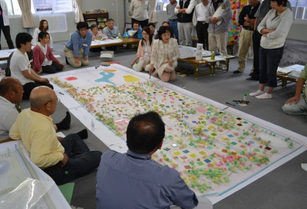 プロジェクトの特長は、住む人たち自らが移転・再生を手掛けたことです。支援チームの石川教授たちは、現地でのワークショップから始め、家族や家を失い、喪失の中にいる被災者の方々と、お仕着せでない居住地再生に着手します。現地を歩き、おはじきと大きな地図で「新しいコミュニティの候補地」を決める作業には、村の寄り合いの力が発揮され、喪失の闇に灯る光にもなりました。