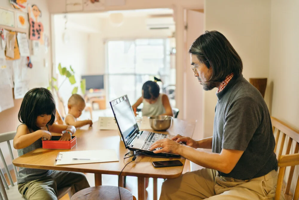 日本では、母親が在宅ワークをしている隣で兄妹が勉強をしている画像でした。