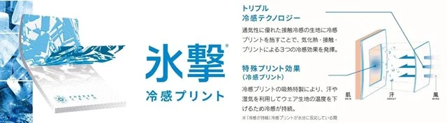 近年では「生地温度」に注目した機能性衣類がたくさん市場に出回っていますが、こちらのフリーズテックは接触冷感生地に加え裏地全面にエリスリトール、キシリトールを含有した特殊な《氷撃冷感プリント》を施しているとのことで、実際に着てみましたが自然にひんやりする心地よさで驚きでした。