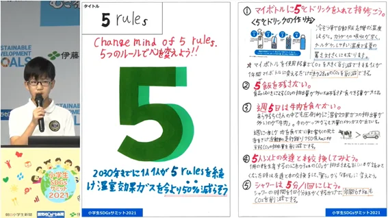 インターナショナルスクールに通い、普段からグローバルな問題について学ぶ山田くんは、これ以上温室効果ガスを増やさないために、話題の『セブンルール』ならぬ『5ルール』について英語を交えて発表しました。