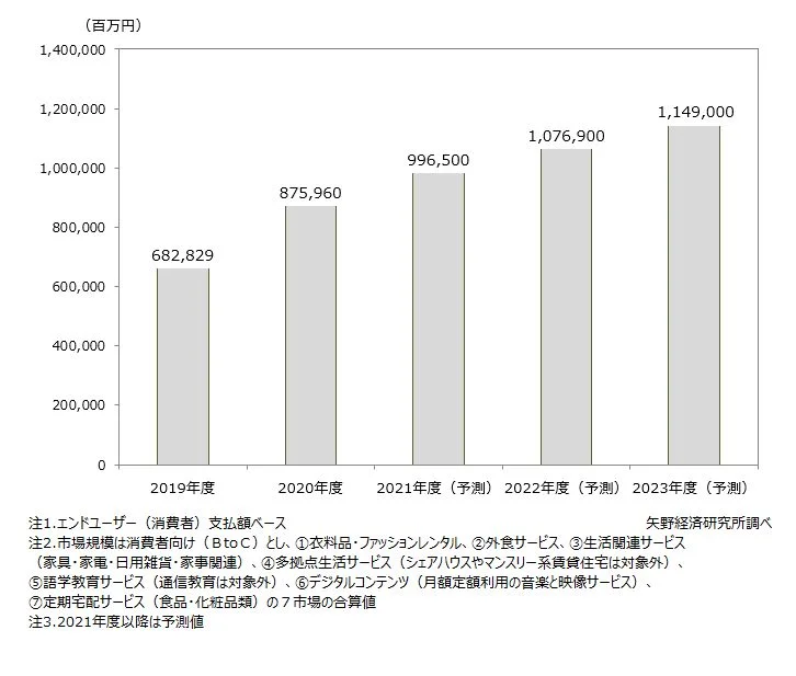 古くは雑誌や新聞の定期購読がメインだったサブスクリプションサービスは、音楽や動画配信、さらには車や家具、傘など、様々なものを対象に拡大を続けています。矢野経済研究所の調査によると、2020年度におけるサブスクリプションサービスの国内市場規模は、エンドユーザー(消費者)支払額ベースで前年度比28.3%増。今年度は13.8%の増加が見込まれ、2022年度以降も増加の予想となっています。