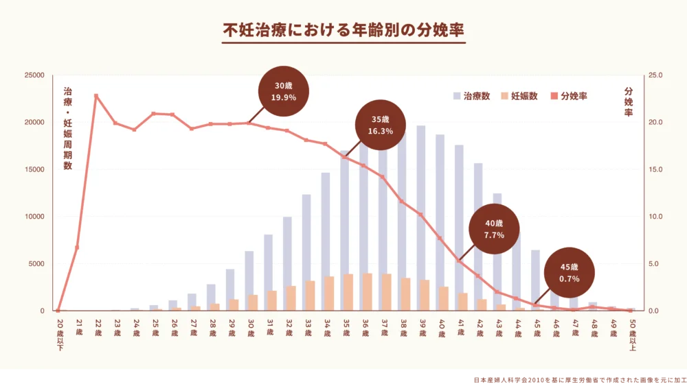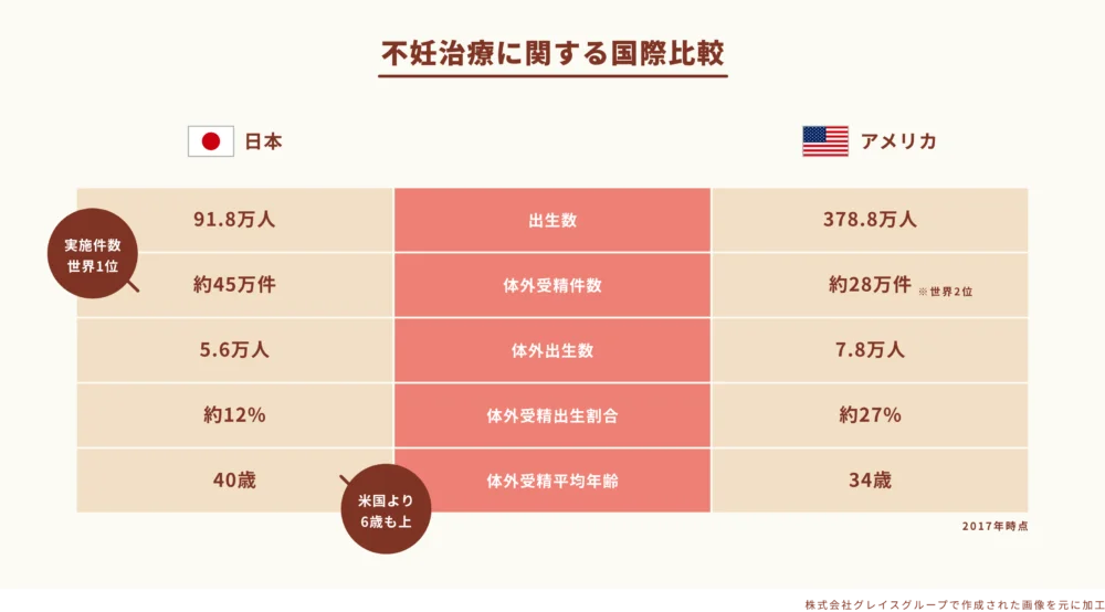 ある調査によると、日本は世界一の不妊治療大国といえるほど体外受精件数が多いにも関わらず、治療開始の平均年齢が40歳と日本に続いて体外受精件数が多いアメリカに比べ大きく後れをとっています。