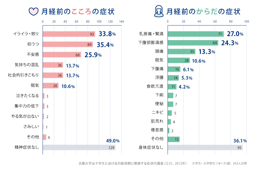 例えばPMSについてです。PMSとは「月経前症候群」のことを指します。月経前の3~10日の間に続く精神的・身体的な症状で、月経が始まるとともに症状がおさまったり、無くなったりするものを指します。症状は人それぞれですが女性のほとんどが何らかの不調を示します。