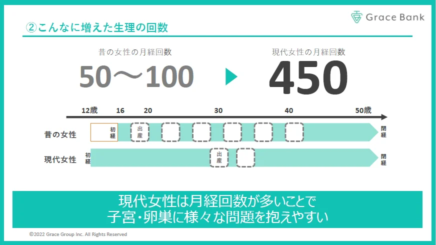 女性の生涯の月経回数は、昔は50~100回といわれていましたが、現代では450回と約5倍といわれています。