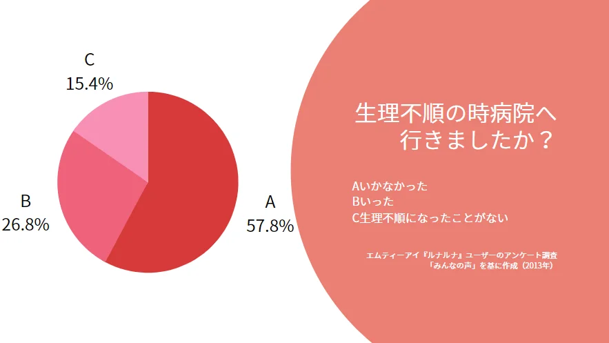 これは多くの女性が共感してしまう問題ではないでしょうか。下記は生理管理アプリ「ルナルナ」で行われたアンケートの結果です。今回のセミナーだけではなく、多くの女性が生理不順を経験しているにも関わらず、半数以上が病院へは行っていないことが分かります。