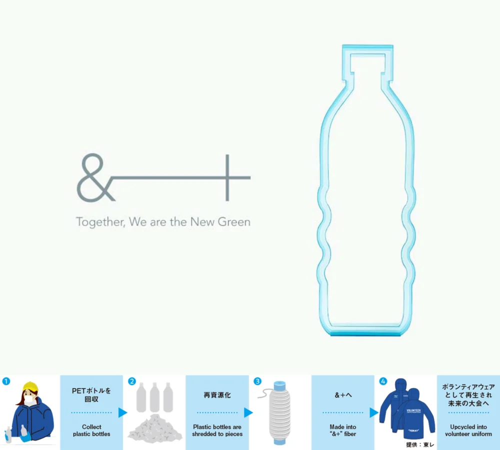 今大会から新たに、東レ株式会社のリサイクル繊維ブランド&+®(アンドプラス)と連携し、大会当日にランナーに提供した給水(スポーツドリンクや水)のPETボトルが、繊維にリサイクルされ、ボランティアウェア(2024大会予定)に生まれ変わります。