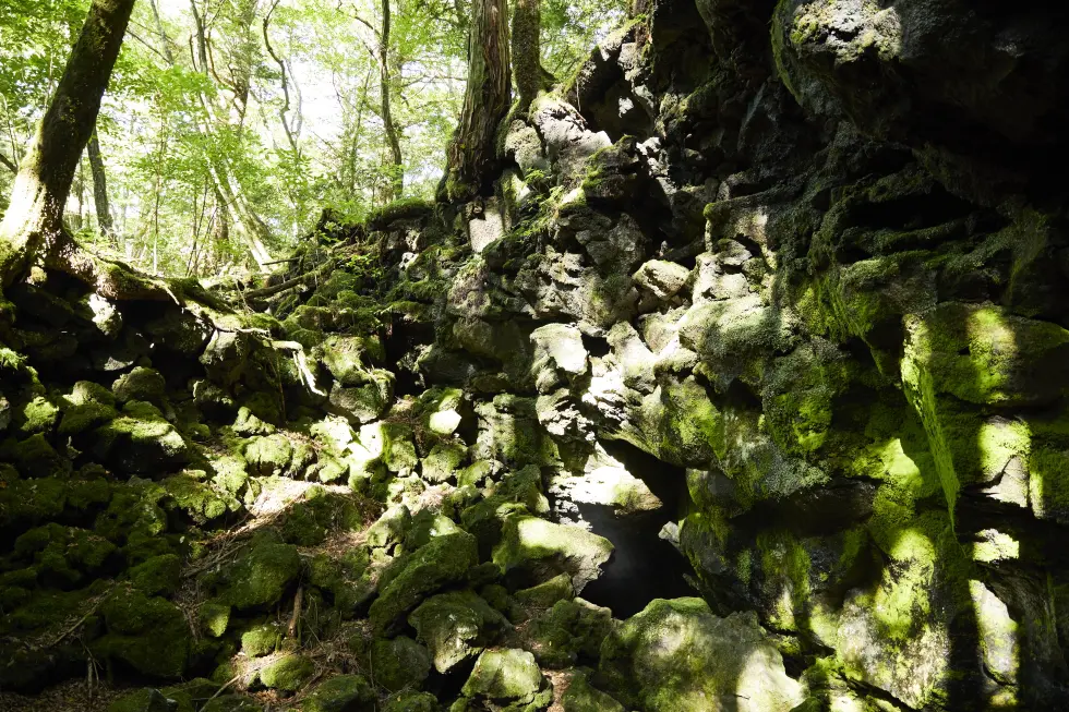 富士山の北西麓に広がる青木ヶ原樹海は、約1200年前に起きた富士山の噴火(貞観噴火)の溶岩流の上に木々が生い茂った森林になります。溶岩流の上に広がる特殊な環境の森林はさまざまな形の木や、苔が生い茂った岩など、他ではあまり見ることができない神秘的な光景を目にすることができます。