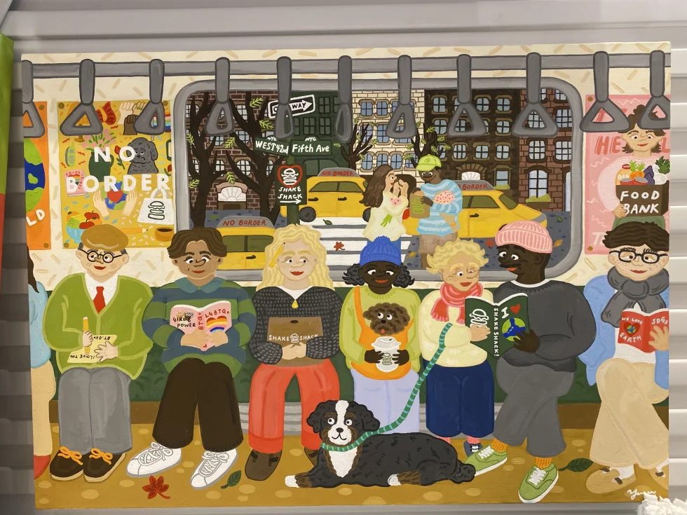 さまざまなバックグラウンドを持った人が隣り合わせに座る地下鉄内を描いた作品の中で、地下鉄の窓の外に見えるのはShake Shackのロゴをはじめ、アメリカを感じさせる街並み。ロンドンの地下鉄の窓の奥に見られる、なんとも贅沢な作品です。