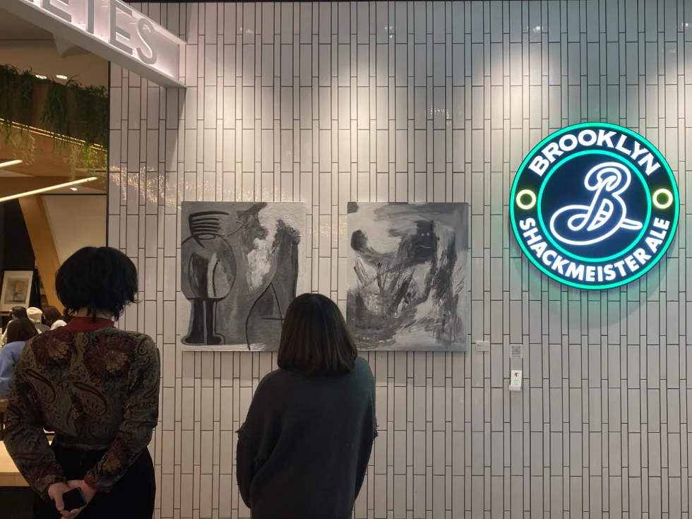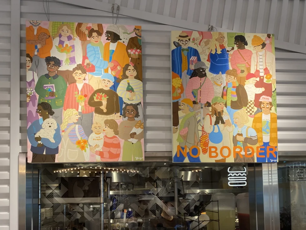 開放感のある二子玉川店の壁に、8名のアーティストによるパワーと個性に溢れた作品が並んでいました。ハンバーガー屋さんでありながら、まるでミュージアムに来ているようです。