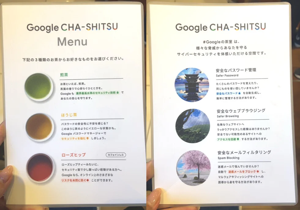 このイベントで味わえるのは、サイバーセキュリティを勉強しながら、煎茶、ほうじ茶、ローズヒップティーといった3種類のお茶を楽しむことができる新しい空間。最近では、リモートワークやシェアオフィスでの勤務も増え、社用のパソコンやスマートフォンを持ち歩く必要があったりと、セキュリティ強化の需要はますます高まっています。もちろんプライベートでもサイバー攻撃にあわないための対策が必要。情報収集の点からも、この茶室空間では、Googleのサイバーセキュリティを身近に感じることができます。
