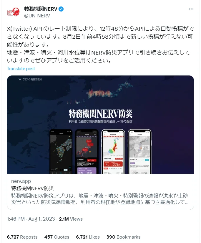Xの閲覧や投稿回数の制限により、災害時の情報がタイムリーに伝わらないことが課題に上がり、2023年8月15日には政府や公的機関からの防災・災害情報の発信に関しては自動で投稿できるよう対応することを公式Xが投稿で表明されました。