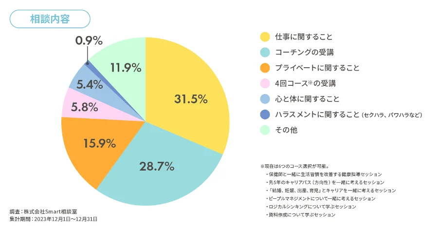 また、 11月と比較して12月の特徴を挙げると、「コーチングの受講」(28.7%)が占める割合があがっています。こうした企業の支援サービスには利用回数の制限のあるものが多いですが、「Smart 相談室」は制限がない(※)ため、モチベーションの維持・向上や、自身の思考の癖や価値観と向き合いながら行動を改善するきっかけとして、多くの利用者が継続的に活用しています。12月は特に、コーチングを通じた1年の振り返りや今後自身が取り組むべき課題を明らかにしたい人が多かったと考えられます。