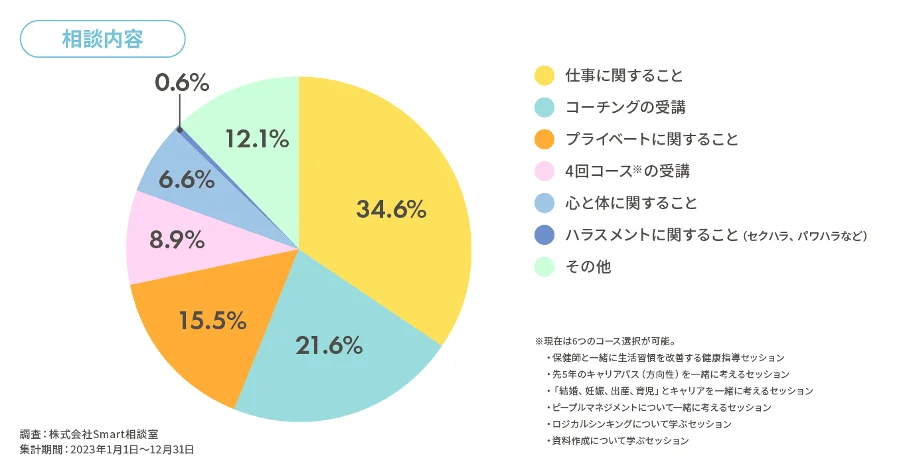 2023年全体を通して内訳を見ると、同じく「仕事に関すること」の相談の割合が34.6%と最も高く、すべての月で30%を超えていました。「Smart 相談室」は相談者が所属する企業から福利厚生として提供されるため、仕事に関連するテーマについて相談する利用者が多いこと、また上述したように社内で相談しにくい悩みが寄せられやすいことが明らかになりました。