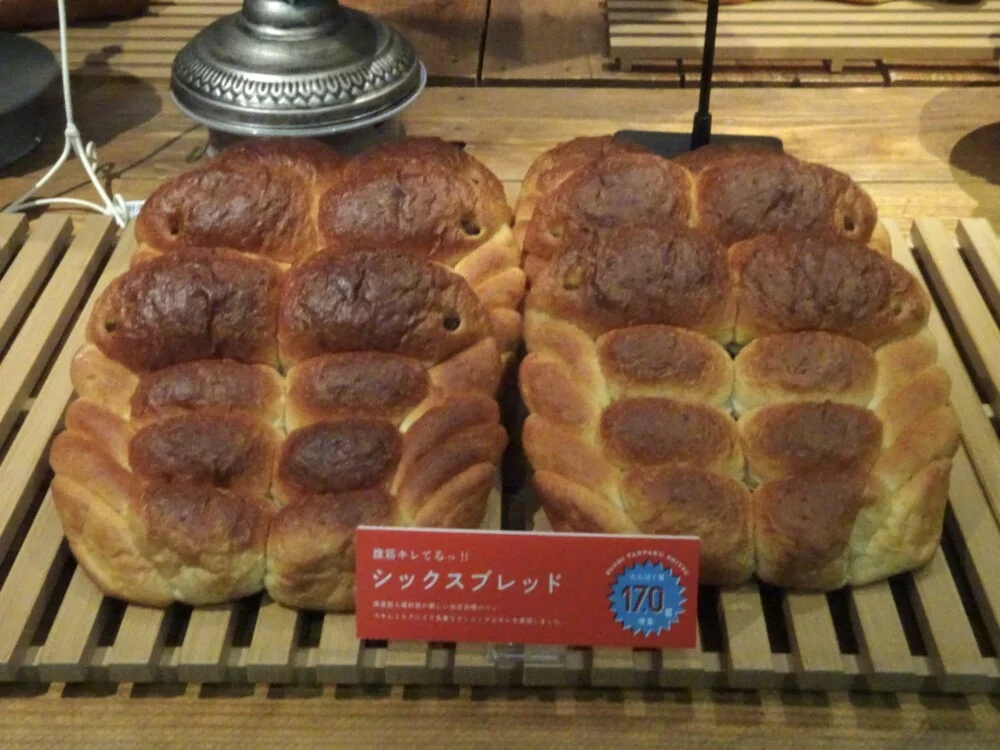 イベントでは、6種類のパンと3種類のスープ・ドリンクが用意されていました。スキムミルクを使うと、パンの焦げ目がきれいに出るため、艶やかなこげ茶色はまさにマッチョな筋肉。ムキムキの腹筋を模した「シックス・ブレッド」は、スキムミルク含有量が50gで、なんとタンパク質が17gも摂れるパンになっています。そのほかにも、大胸筋をイメージした「チェストプレスサンド」、三角筋をイメージした「肩メロンパン」など、筋肉をイメージしたパンの数々に、来場者は目移りしていました。