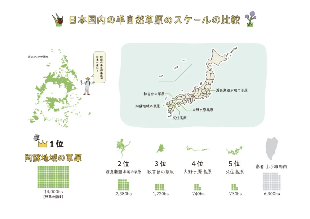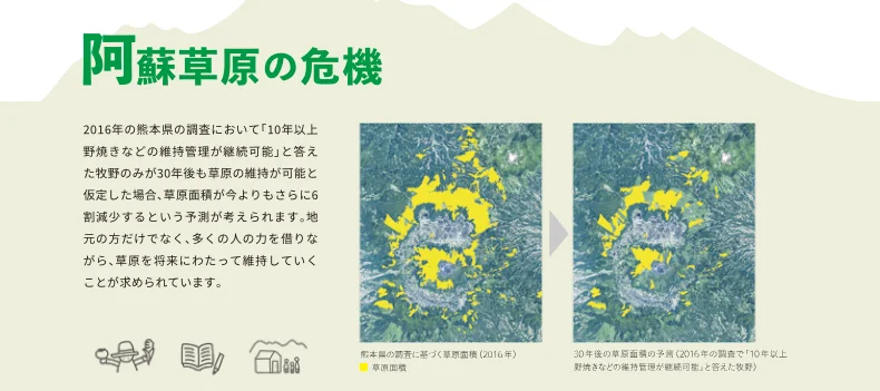 明治時代には国土の10%を覆っていた草原は、今や1%に満たない面積まで激減しています。それは、日本一の面積を誇る阿蘇の草原も例外ではありません。歴史を顧みれば、人と草原の関わりが少しずつ変化するのはごく自然なことですが、草のニーズが減ったとしても草原に宿る本質的な価値は変わりません。