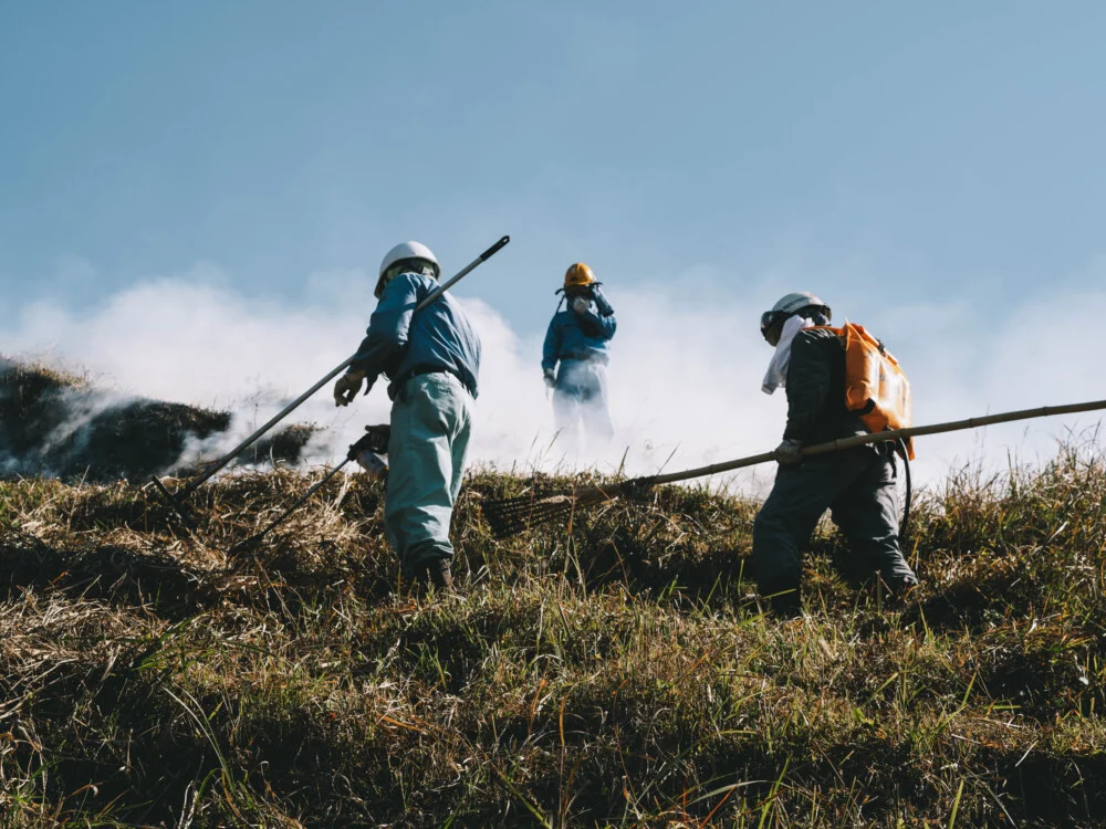 そもそも「野焼き」の作業とは、どのように行われるのでしょうか。草原に火を放ついわゆる「野焼き」の作業自体は、3月〜4月にかけて行われますが、単純に枯れ草に火を入れるだけでは瞬く間に山火事になってしまいます。安全に野焼きを実施するためには、前年度の夏から秋にかけて草原と隣接する森林の間の草を幅6〜10メートルほど刈ります。その後、刈った草を燃やし、防火帯を作ります。