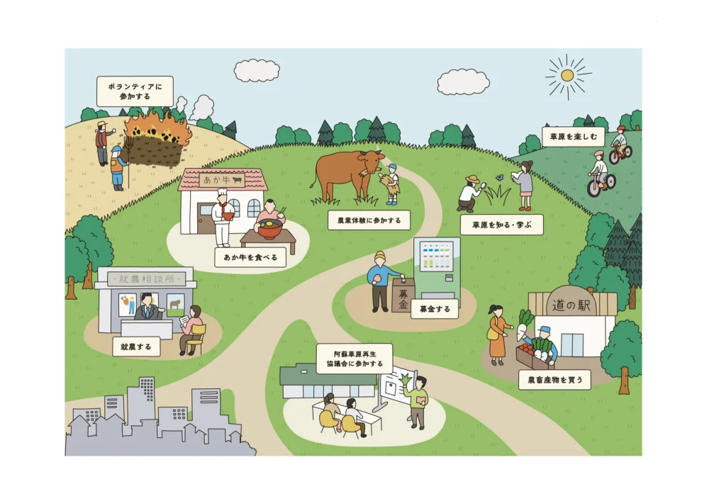 阿蘇の草原の場合は、あか牛や野草堆肥を使った野菜を食べること。草原を訪れ、アクティビティに参加すること。野焼き支援ボランティアの講座を受けたり、支援すること。そのどれもが草原の保全活動につながっています。地球と生きるすこやかな未来に紡ぐのは、あなたが起こす一つひとつのアクションです。