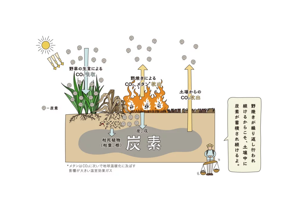 では、なぜ1万年もの間、草原を維持することができたのでしょうか。それは人間にとって草は、住まいや肥料、家畜のエサなど、多用途に使える暮らしの糧だったからです。野焼きを欠かさず行っていれば、毎年“草”という資源を享受できる。このことは、人類にとって大きな発見だったに違いありません。一方で草原の植物にとっても野焼きをすることで発芽が促進されることで、植物や生物の新たないのちをはぐくむ役割を担ってきました。「野焼き」は草原と人、両者のいのちをつなぐためになくてはならない営みです。