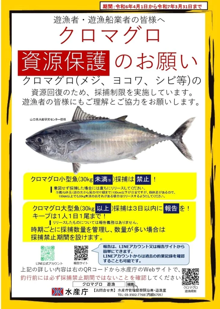 また、時期別採捕数量のルールも変更になりました。まず小型魚(30キロ未満)は採捕禁止で、「釣れたら直ちにリリースすること」とされています。30キロ以上の大型魚のキープは1人1日1尾までで、1尾キープした後に別のクロマグロが釣れたら、後に釣れたクロマグロは直ちにリリースすることとなっています。