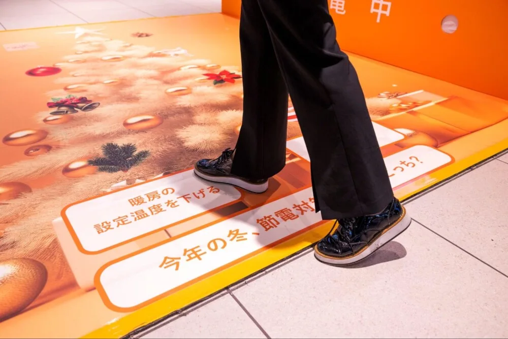 発電床には「今年の冬、節電対策するならどっち?」という質問と、その回答として「暖房の設定温度を下げる」「一枚多く重ね着する」の選択肢が書かれています。踏むことで音が鳴る楽しい仕組みで、家族やカップルでも誰もが楽しめる形です。