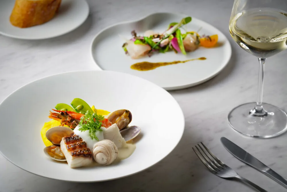 レストラン『Restaurant Cathedréclat』では、「新たな異文化が交わるガストロノミー」をサービスコンセプトに、長崎の伝統的な文化である和・華・蘭の要素を取り入れた食体験が可能とのこと。異文化が交差する面白さを五感で味わえる革新性が魅力的。シグネチャーコース「Blanche」では、長崎の旬の魚介をはじめ、長崎和牛のパイ包焼きや長崎で〆に好んで食べられるおにぎりを使ったお茶漬けなど、全6品に舌鼓を打てるそうです。