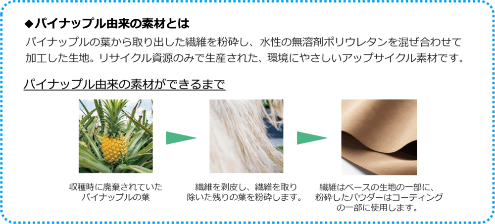 パイナップルの葉からできた素材を使用した地球にやさしいランドセル「パイナセル」をご存知でしょうか。ランドセルの大手メーカー、セイバンが販売しているこの「パイナセル」は、パイナップルの収穫時に廃棄される葉から繊維を取り出し、粉砕して、水性の無溶剤ポリウレタンを混ぜ合わせて加工した「パイナップル由来の素材」を使用しています。スウェードのような独特な質感を持ち、マットでやさしい風合いが特徴のランドセルです。