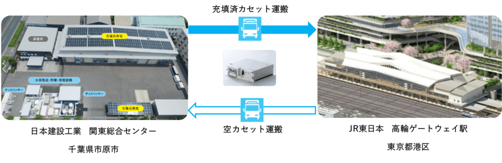 これは、千葉で製造した水素を水素吸蔵合金カセットに充填して高輪ゲートウェイ駅まで運搬し、純水素燃料電池システムへ供給するというもので、運搬時に発生するCO2はJ-クレジット※を調達してオフセットします。