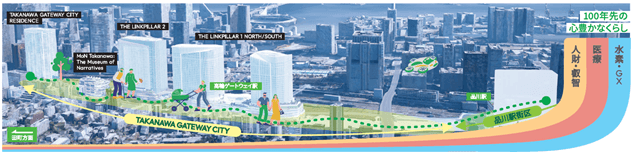 TAKANAWA GATEWAY CITYでは、より良い未来のための社会課題に取り組む“GATEWAY”として、街を舞台に「環境」「モビリティ」「ヘルスケア」のテーマで実証実験や研究開発が進められていきます。