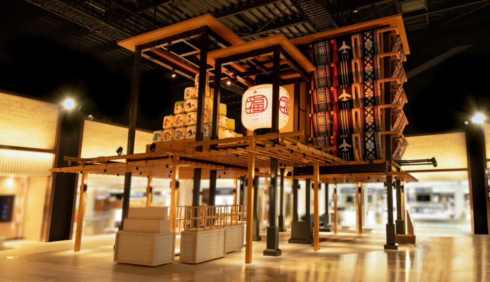 約4倍の広さとなった免税店エリアは、「中州の街並み・屋台・祭りの山車」という福岡を象徴する3つの要素を取り入れ、福岡の光景を連想させる空間へと一新。巡った観光名所のひとつとして数えられる場となることを目指し、日本の雰囲気や文化を楽しむことができる空間を創り上げました。