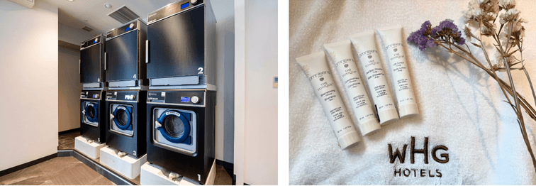 その他、ホテルグレイスリー銀座では、洗濯専用のアルカリイオン電解水「ウォッシュウォーター」の力で洗い上げるアレルゲンフリーの洗濯機を導入しています。肌にやさしく、クリーンな排水によりSDGsの目標達成にも貢献する最新式のホテルランドリーです。また、11階以上の全客室には、フランス・パリで誕生した高品質なアメニティブランド「オムニサンス・パリ」のシャンプー・コンディショナー・ボディソープ・ボディローションを採用。天然由来でお肌に優しいだけでなく、環境に配慮したリサイクル可能なパッケージを使用しています。
