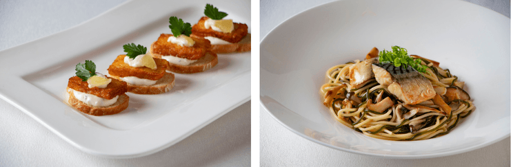 広島ワシントンホテルでは、広島名物の揚げかまぼこ「がんす」とバゲットを掛け合わせた「がんすの和風ブルスケッタ」。佐世保ワシントンホテルでは、長崎県南島原市の伝統麺「ひょっつる」を使った