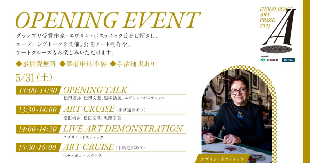 展覧会初日の5月31日(土)には、グランプリ受賞作家エヴリン・ポスティック氏やヘラルボニーの両代表、審査員の一人でもある黒澤氏によるオープニングトーク、エヴリン・ポスティック氏による公開アート制作、ヘラルボニースタッフによるアートクルーズなど多くのコンテンツが実施されます。いずれも参加費無料、事前申込不要で手話通訳もあります。