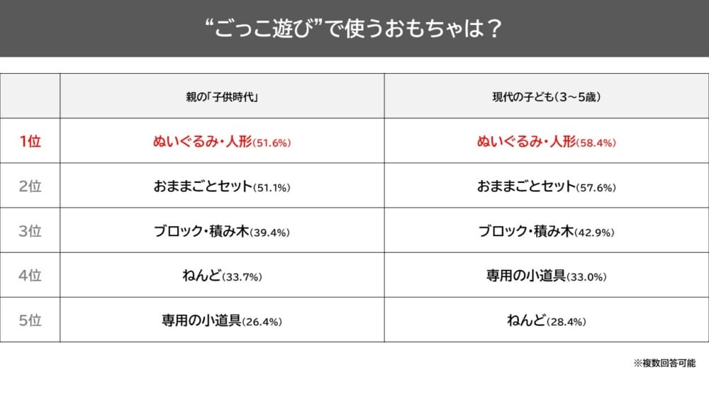 また、“ごっこ遊び”に使われるおもちゃとしては、「ぬいぐるみ・人形」「おままごとセット」「ブロック・積み木」「ねんど」「小道具類」が上位を占め、世代を超えて定番の道具が根強い人気を集めていることもわかりました。