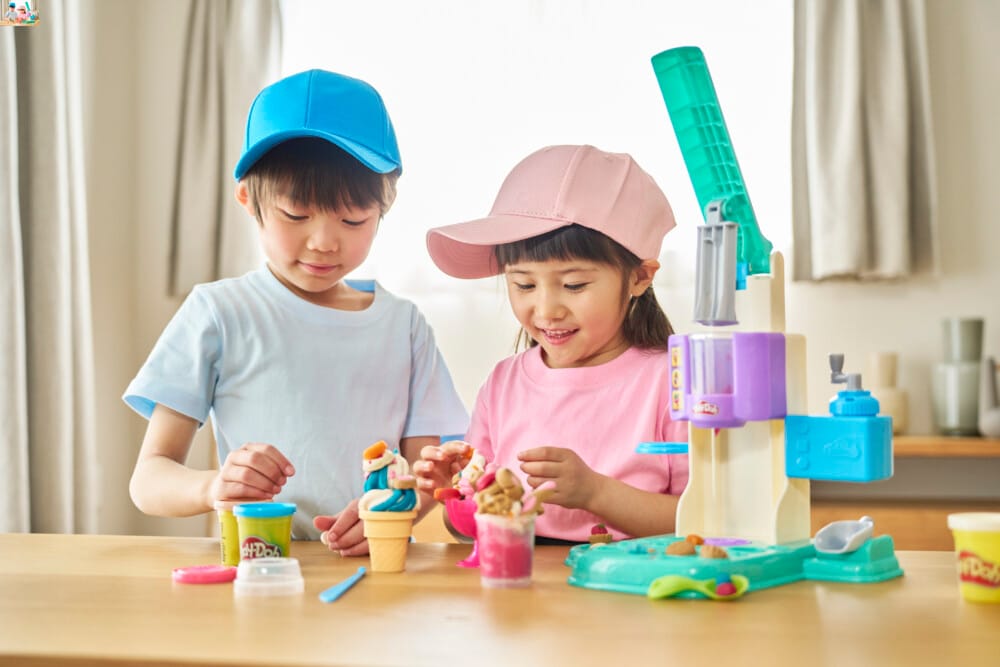 ごっこ遊びとの相性も抜群で、「歯医者さんごっこ」や「パスタ屋さんごっこ」といった親しみやすいシチュエーションなら、親も戸惑うことなく自然体で子どもと向き合うことができ、想像の世界を一緒に楽しむきっかけにもなるはずです。「プレイ・ドー ねんどでおかしやさん わくわくスイーツメーカー」や「プレイ・ドー トッピングいっぱい!カラフルソフトクリームメーカー」を使えば、「お店やさんごっこ」がよりリアルで没入感のある体験に。ケーキやアイスクリームを作って商品に見立てることで、「売る」「買う」「作る」といった社会の仕組みに自然と触れながら、創造力や表現力、さらには社会性まで、幅広い力を育てていけるのです。