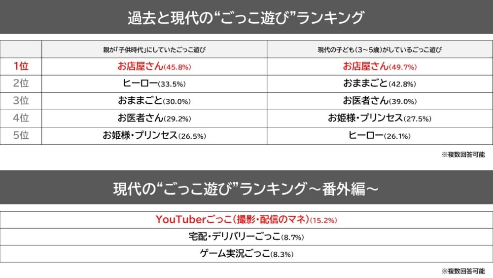 ハズブロジャパン合同会社が3〜5歳の子どもを持つ親1,100人に行った「ごっこ遊び」に関する調査によると、親子で最も人気の“なりきり遊び”は「お店やさんごっこ」。次いで「おままごと」や「お医者さんごっこ」が続き、家庭や職業を模した遊びが主流であることがわかりました。さらに子ども世代では「YouTuber(15.2%)」「宅配ごっこ(8.7%)」といった、時代を反映したごっこ遊びも挙げられており、日常にある職業への興味がそのまま遊びに投影されています。