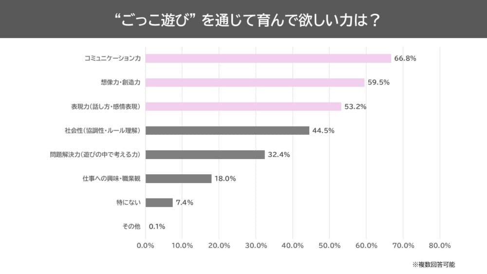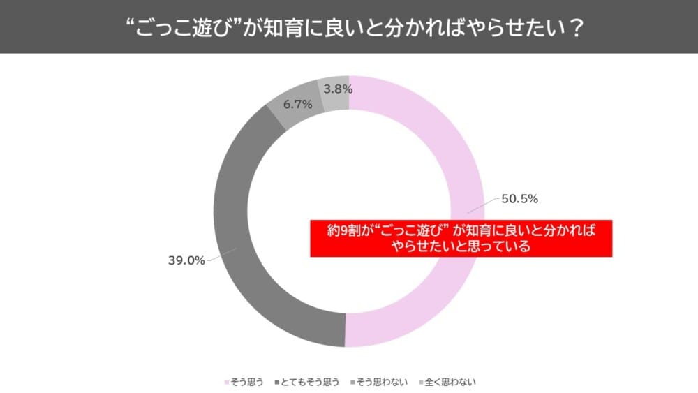 実際、調査でも「子どもの成長に役立ちそう」「楽しい」「親子の絆が深まると感じる」といった声が寄せられごっこ遊びは子どもにとってだけでなく、親にとっても“価値ある時間”として受け止められていることがわかります。