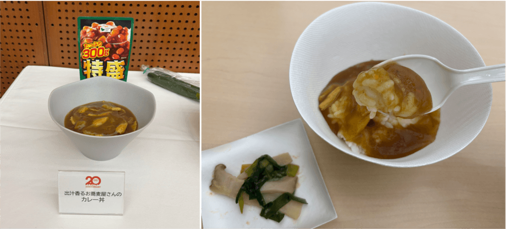 メディア向けブランド発表会では、「出汁香るお蕎麦屋さんのカレー丼」と「木の子の酢味噌和え」が試食として提供されました。