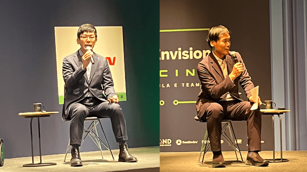次のパネルディスカッション第1部には、エンビジョン・レーシングのマネージングディレクター兼CTOのシルヴァン・フィリッピ氏と株式会社AESCグループCEO 松本昌一氏が登壇。フォーミュラEのプレゼンターでもあるサンダース・カーマイケル・ブラウン氏がモデレーターを務めました。