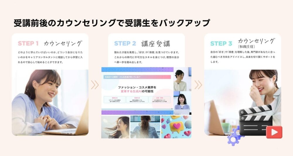 サービスの利用方法も簡単で、キャリアコンサルタントとのオンラインでのカウンセリングを行うだけで希望講座を受講することができます。