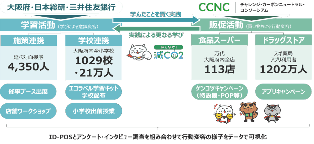 さらに、未来を担う子どもたちへのアプローチとして、大阪府内の全小学校・約21万人に学習キットを配布し、CFPやエコラベルについて学べる出張授業も実施。家庭や地域にも脱炭素の意識を広げるきっかけとなっています。