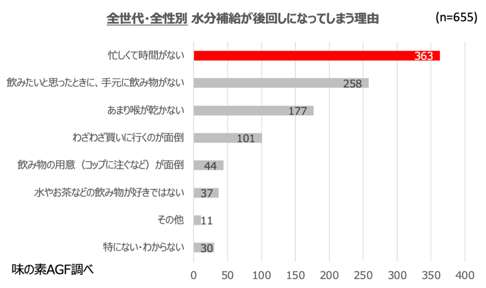 さて、ここで一度、上のグラフをご覧ください。冒頭にもお伝えした通り、水分補給を “後回しにしてしまう”人が多い状況の中で特に理由として挙げられたのが、「忙しくて時間がない」というものでした。「ブレンディ®」マイボトルスティックは、その悩みに寄り添ってくれる存在と言えそうですよね。