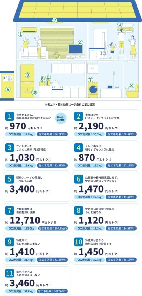 また、エアコンなどの使⽤により、発電時に排出されるCO2やフロンガスは地球温暖化にも影響を与えることから、節電と節約は密接に関係しているといえます。