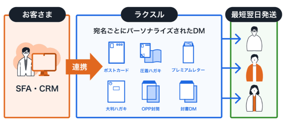 さらに、Treasure Data CDPやSales Markerなど顧客データを営業やマーケティングに活かすためサービスと連携することで、宛名データの自動取り込みや、送付後ログ取得・行動履歴統合も可能に。