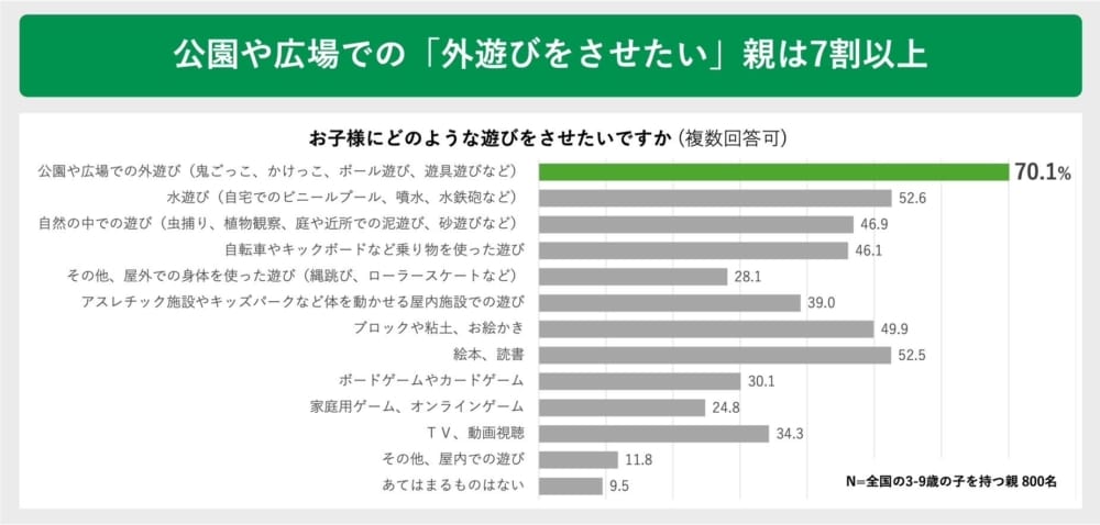 外遊びを望む親が多い一方で、実態は理想とのギャップが際立った結果でした。