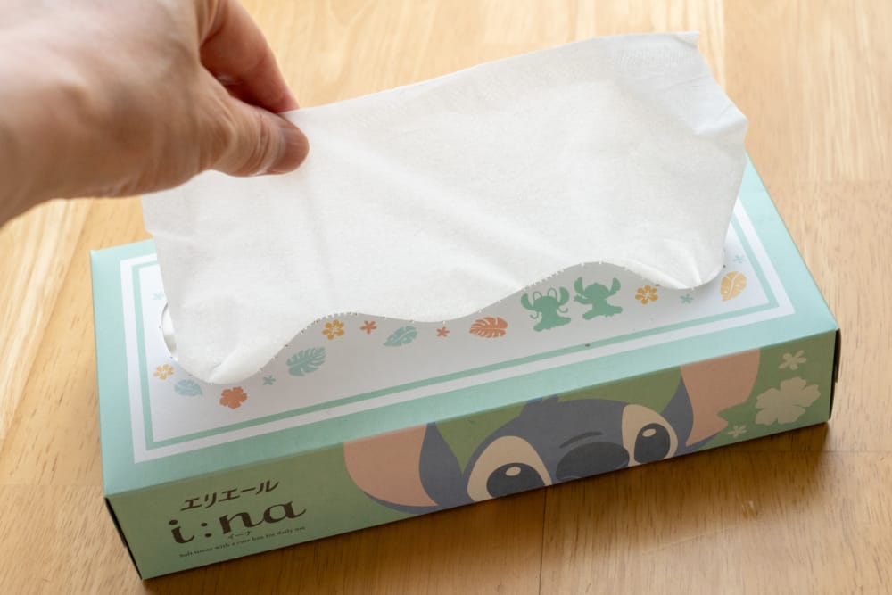 「エリエール i:na(イーナ)ティシュー ディズニーデザイン フィルムレス」は、使いやすさにこだわったコンパクトサイズです。幅広い世代に人気のディズニーキャラクターが描かれていて、実写映画化で話題の『リロ&スティッチ』のスティッチのほか、ミッキーマウス&ミニーマウス、『くまのプーさん』のプーさん、ティガーが描かれた、5種類の明るく楽しいパッケージデザインとなっています。