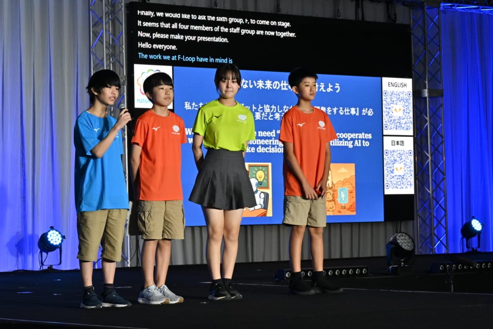 あるグループは、この⼤阪関⻄万博で最新技術に触れて感動すると同時にこの技術を知っているか知らないかで⼤きな差が出てしまうという気付きから思いついた、社会問題と最新技術をマッチさせた仕事のアイデアを提案。「将来はさらに便利な道具が開発され、⾃分で何もしなくてもよい世界になるかもしれません。最新の技術を現実の課題とうまく結びつけられるものこそが、未来を⽀える存在になるでしょう。どんな最新技術があるのか知ること、どんな問題とマッチするのか理解することがこれからの社会に必要です」とこのアイデアの需要を伝えました。そして「未来は私たちが思っているよりも早くやってきます。