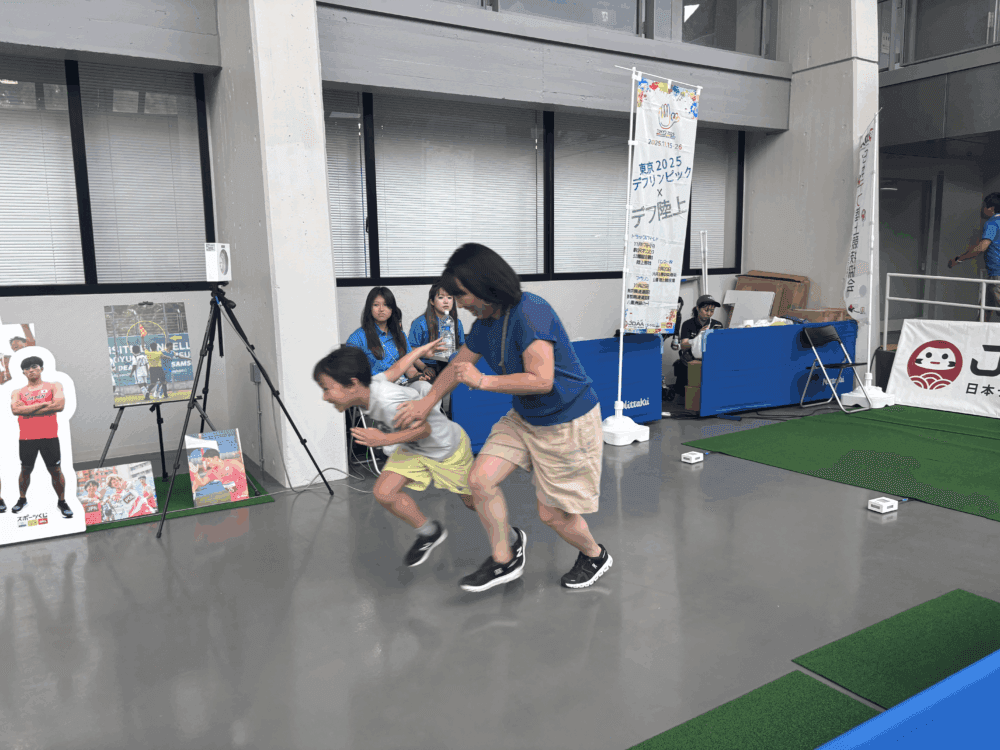 リニューアルイベント当日には、2025年11月に開催される「東京2025デフリンピック」の競技を体験できるブースも登場しました。デフ陸上の模擬体験では、スタートランプと呼ばれるスタート合図を光で伝える装置が用いられ、子どもたちが興味津々に楽しんでいる様子を伺えました。