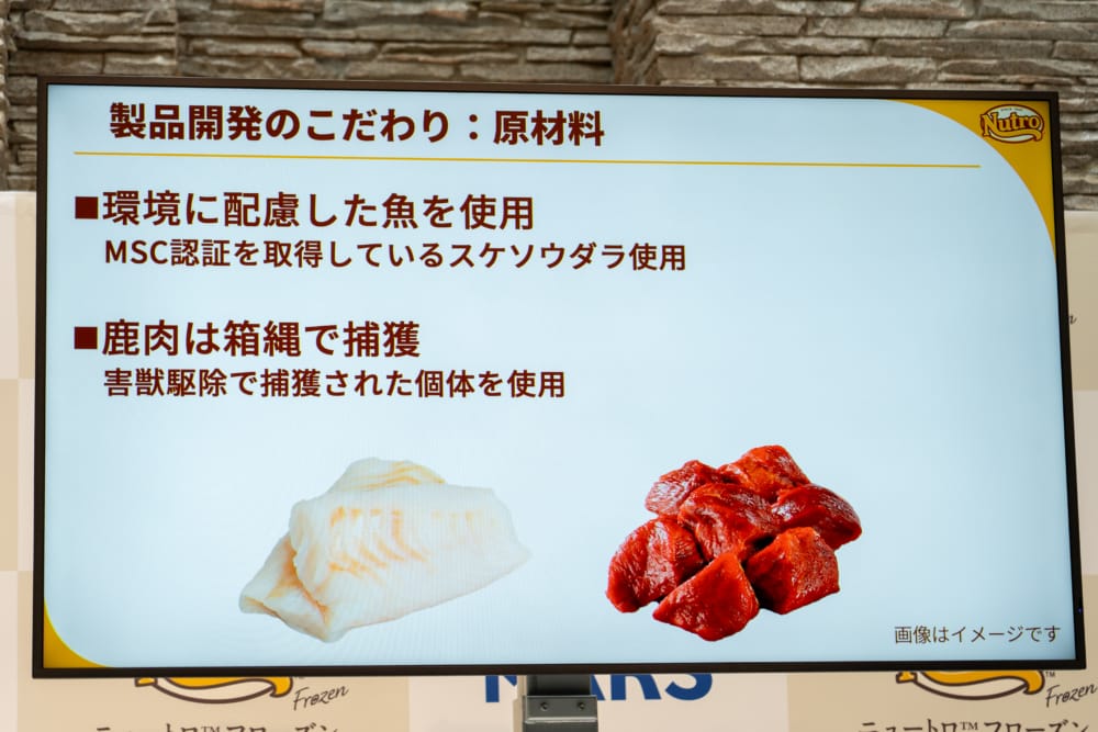 グローバルな企業として常にサスティナブルな原材料の調達に力を入れているというマースですが、今回「海 真鯛*3」に含まれるスケソウダラはMSC認証を受けているものを使用しています。MSC認証とは、環境やほかの海の生物に配慮して適切な漁業で捕られた“海のエコラベル”のことです。また鹿肉については、猟銃を使用せず箱罠で捕獲した個体を使用しています。